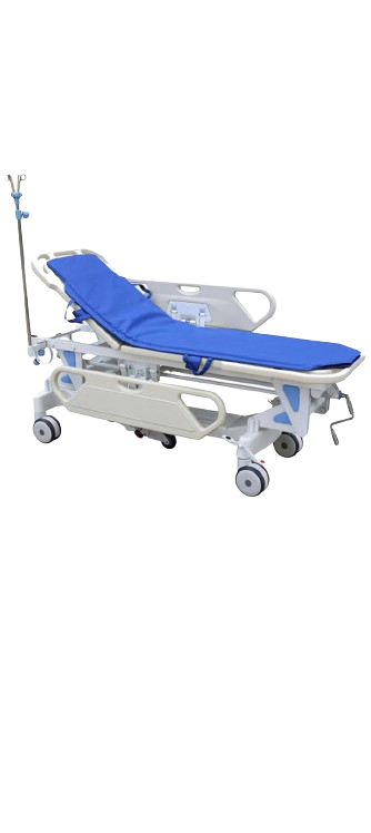 Manual Patient Transfer Stretcher/ Recovery Bed (Centrally controlled brake system Pneumatic spring supported back rest Adjustable head elevation Retractable 5th wheel steering system, O2 cylinder holder)