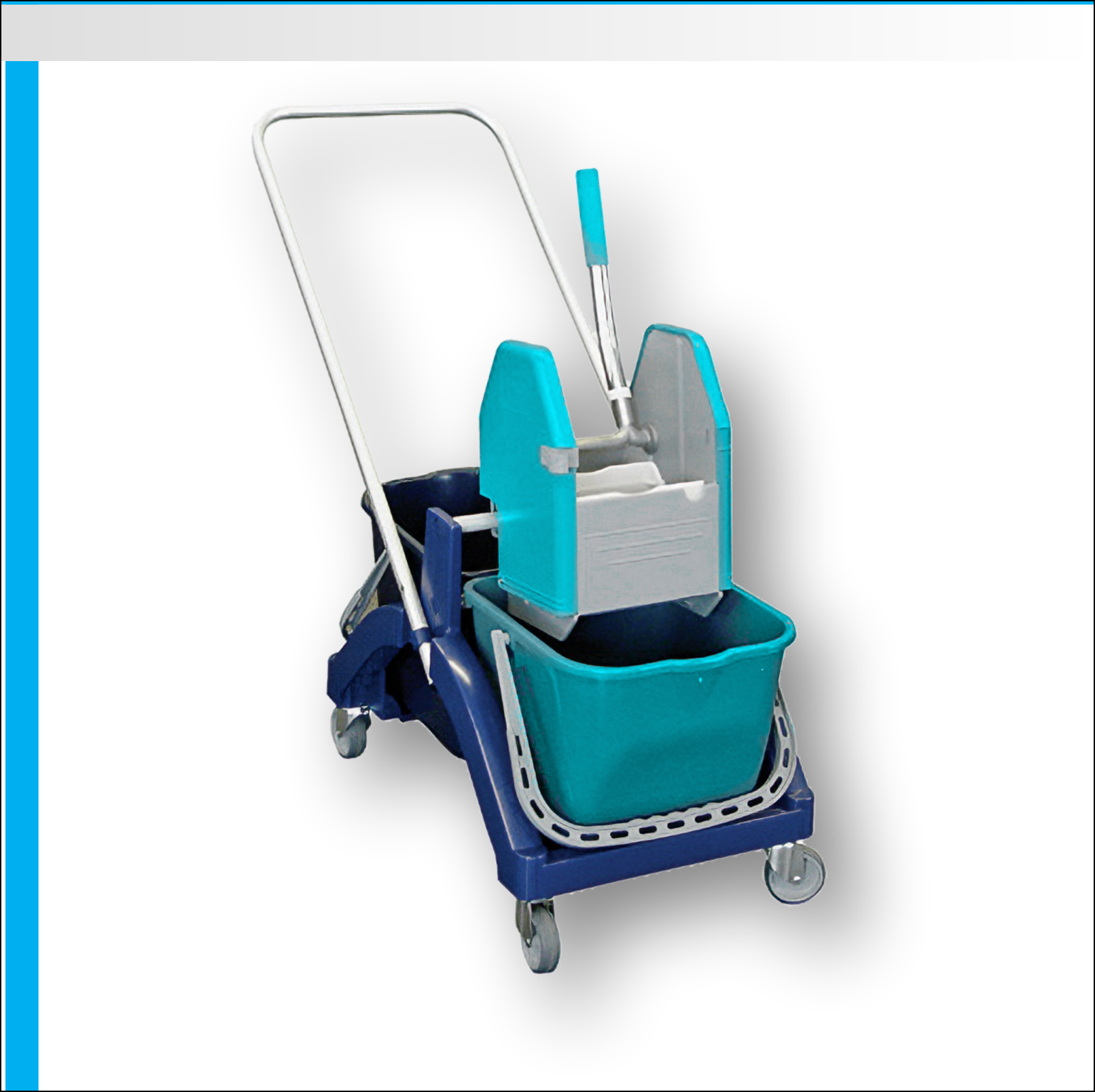 Very sturdy two-bucket wet-mopping unit for high hygiene standards made of galvanized steel tubing.