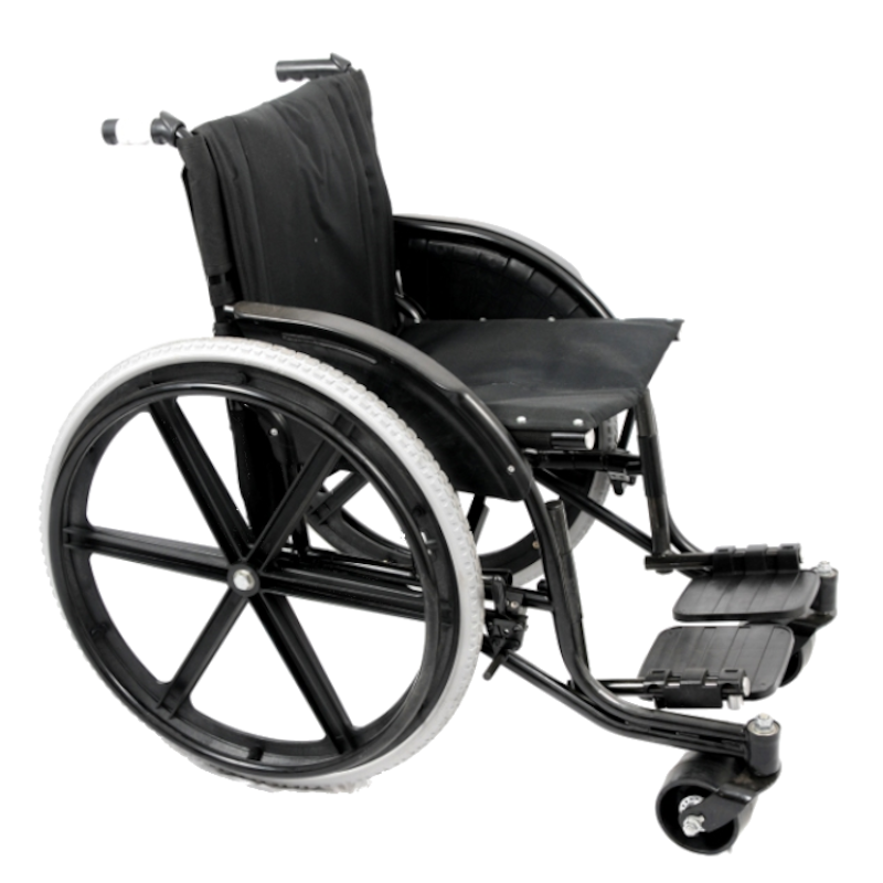 The innovative design of moving the castors forward, without increasing the overall length of the wheelchair, reduces the amount of weight that the castors bear. This allows for easier propulsion of the wheelchair over uneven terrain. The increased width of the castor to 6.5cm, further enhances the chairs ability to navigate rougher terrain.