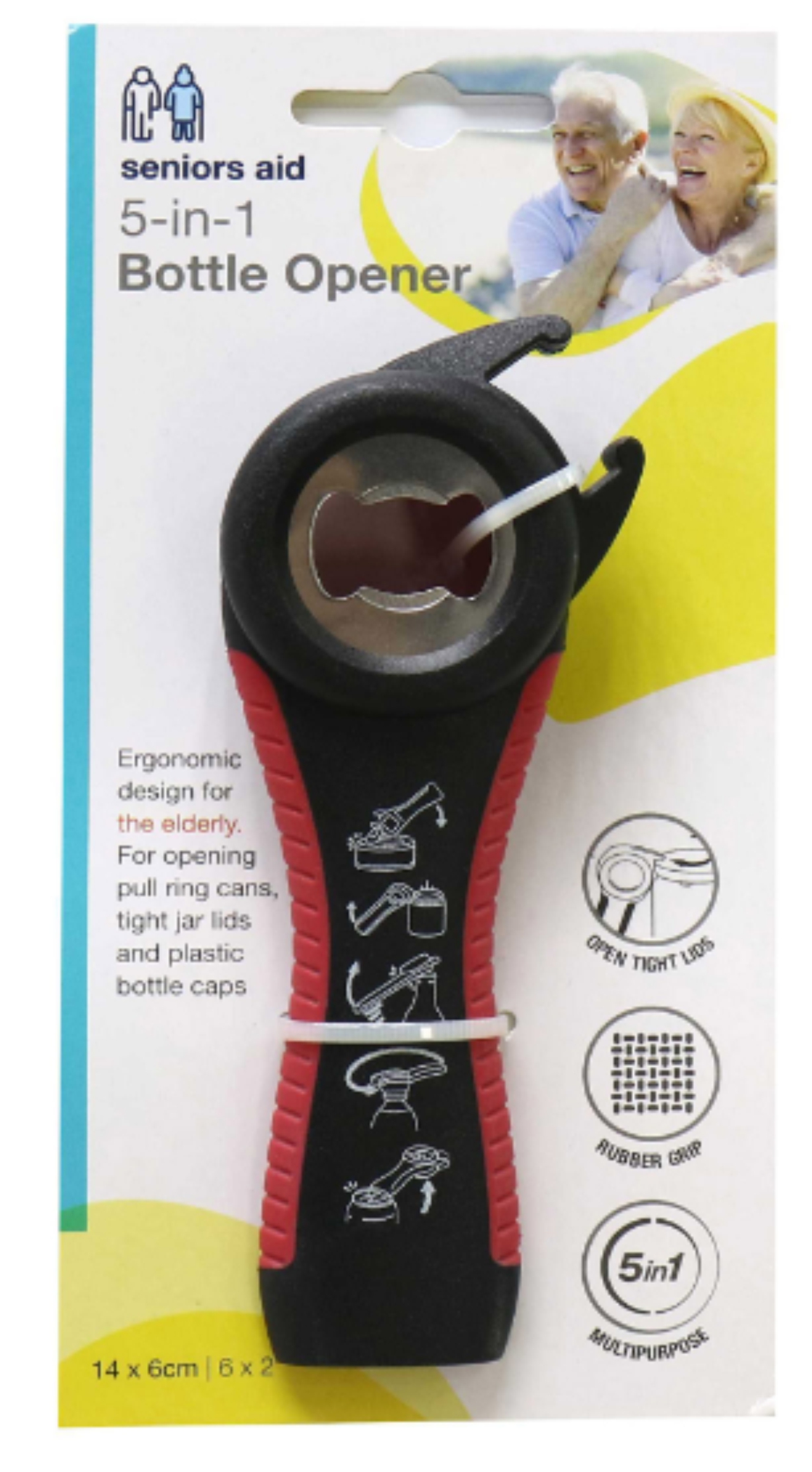 For opening pull ring cans, tight jar lids and plastic bottle caps
